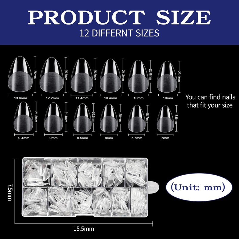 - Natürlicher Look, individuelle Passform. Enthält 10 Präzisionsgrößen von 2 mm bis 12 mm mit ultradünnem, 0,3 mm konischem Taillendesign. Imitiert natürliche Mandelnagelformen ohne sperriges Aussehen für ein nahtloses, leichtes Gefühl.
