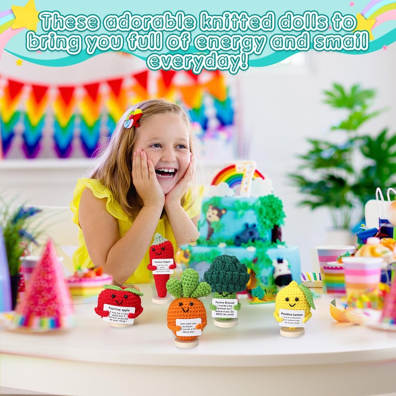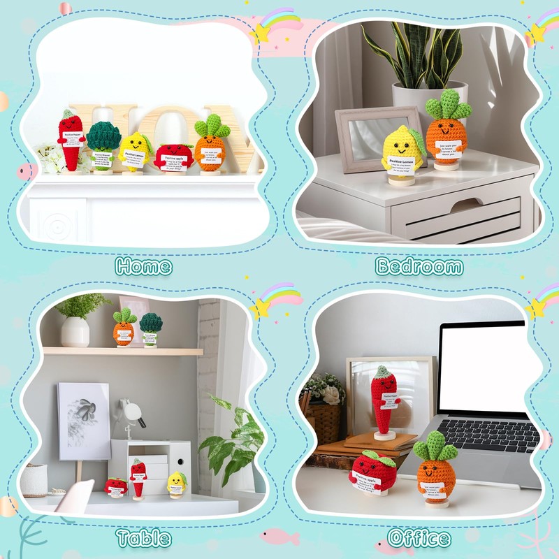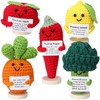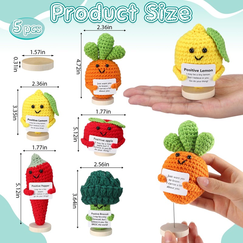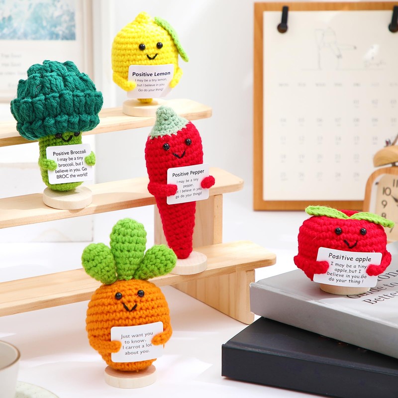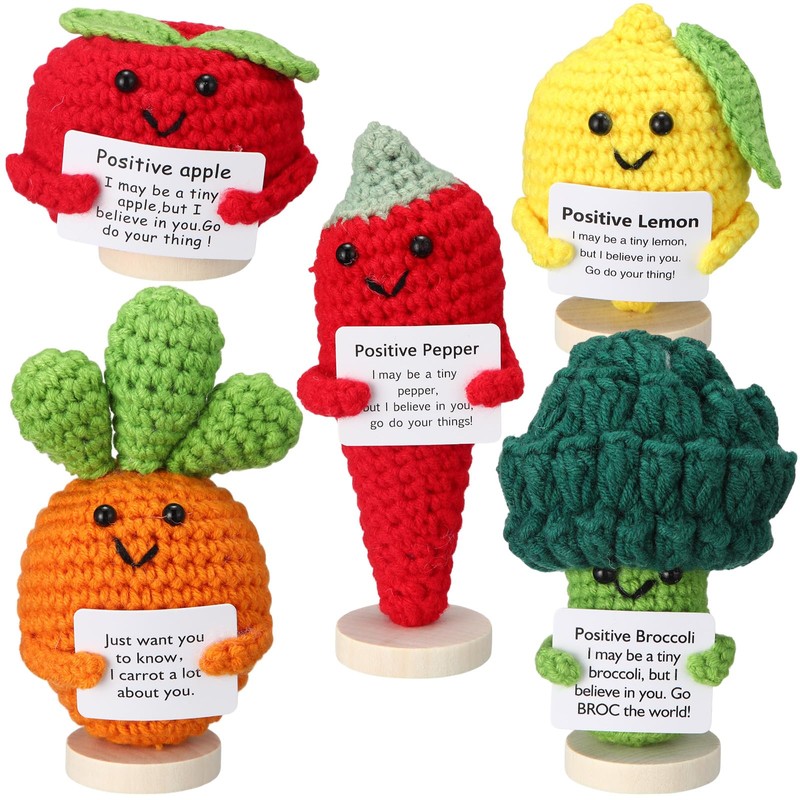 Yuntau 5 Pcs Crochet Positive Vegetables with Base Emotional Fruits with Positive Card Plush Handmade Knitted Dolls Handmade Crochet Inspirational Gifts for Women