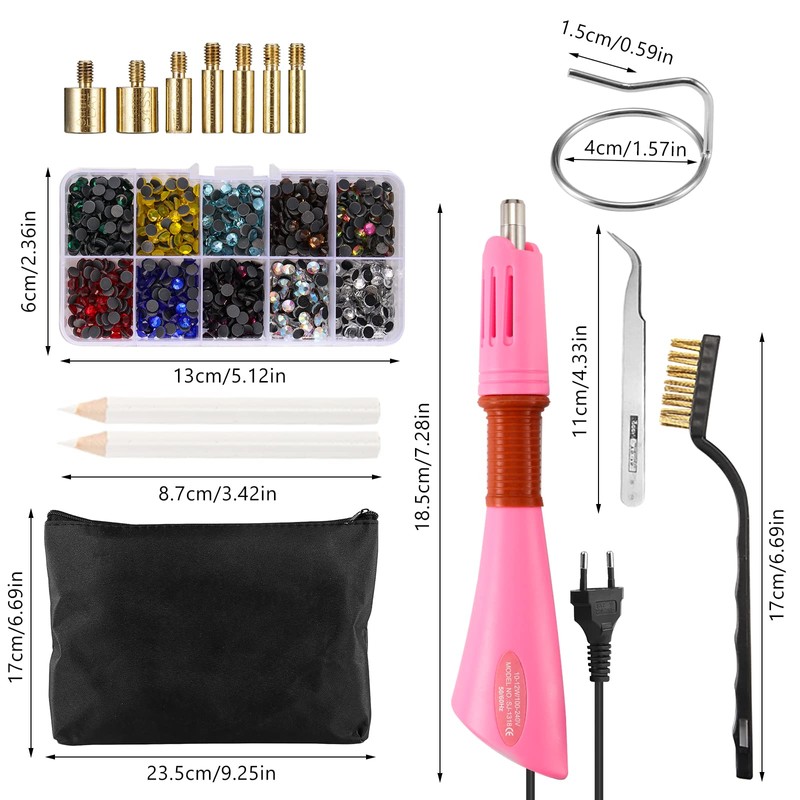 - MULTI FUNCTION SET This hot fix rhinestone kit features a comfortable handle and extra long power cord and includes 1 hot fix applicator, 7 hotfix tips, 1 box of hotfix rhinestones, 2 rhinestone pens, 1 gemstone tweezers, 1 A cleaning brush and a metal stand meet your different creative needs and are your best creative companions.