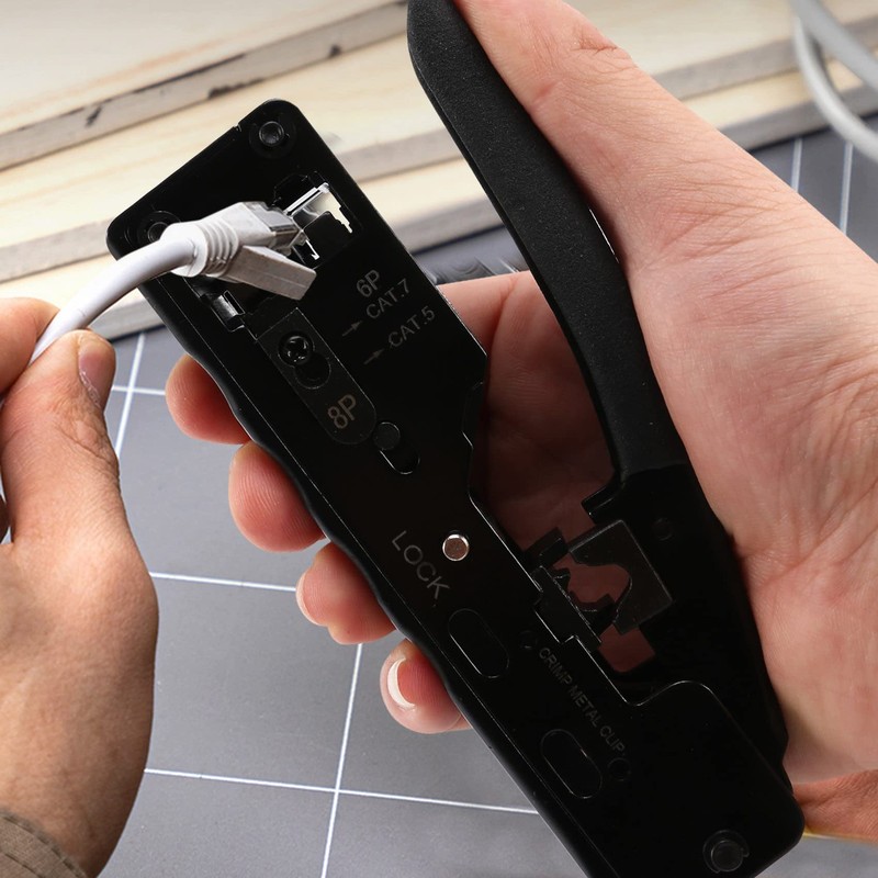 - Built-in Cat7 to Cat5 Switcher - Switch from Cat7 to Cat5 crimping by using a screwdriver to loosen then switch up or down to change the compression mode. Enables you to crimp both shielded CAT6a connectors as well as standard RJ45 connectors. The Cat7 mode stands for Cat7 shielded plugs crimping. Cat5 mode stands for Cat5e and Cat6 plugs crimping.