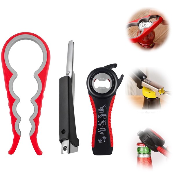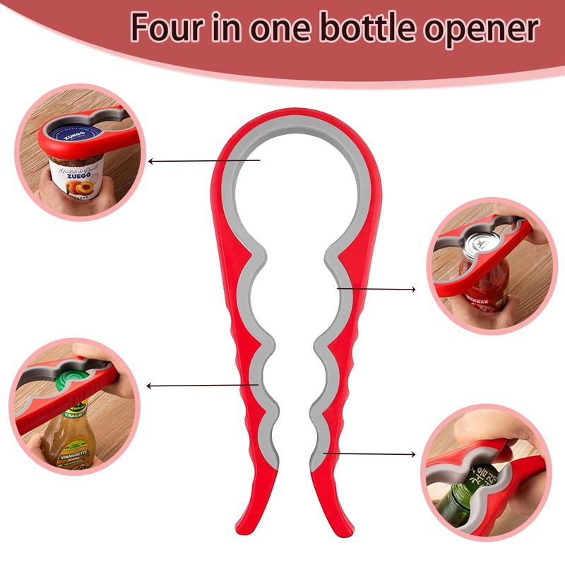 - Multifunctional and convenient operation: the five-in-one lid opener, the screw cap design is suitable for almost all bottle caps and cans with small diameter, 4-in-1 bottle opener can easily open drink cans and has four different sized handles, multiple jaw sizes for your different requirements and a non-slip rubber cover of the wide neck bottle. The opener can hold the lid securely without scratching the surface.