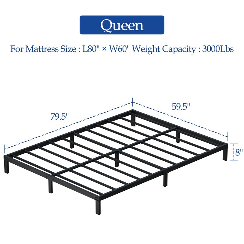 - Queen size bed frame dimension:79.5" L x 59.5" W x 8" H. Weight capacity up to 3000lbs.