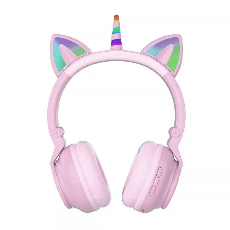 - Diseño de unicornio con luz intermitente: auriculares inalámbricos plegables con oreja de gato de unicornio, diseñados con luz LED de oreja de gato y cuerno de unicornio. Es un regalo ideal para niños pequeños, niñas, niños, estudiantes o aficionados a los juegos de rol. Para ahorrar batería o a su favor, puede pulsar el botón "+" dos veces para cerrar la luz y pulsar dos veces de nuevo para abrir la luz.