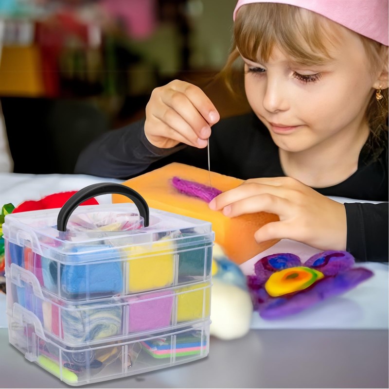 - Complete needle felting wool set: This needle felting starter set contains 48 wool colours, 18 piercing needles, 1 thimble, 1 piercing needle with wooden handle, 1 hand guard, 1 needle nose pliers, 10 noses, 80 eyes, 5 mobile phone straps, 20 opening circles; 1 pair of scissors, 1 storage box; meet your daily felt needs.