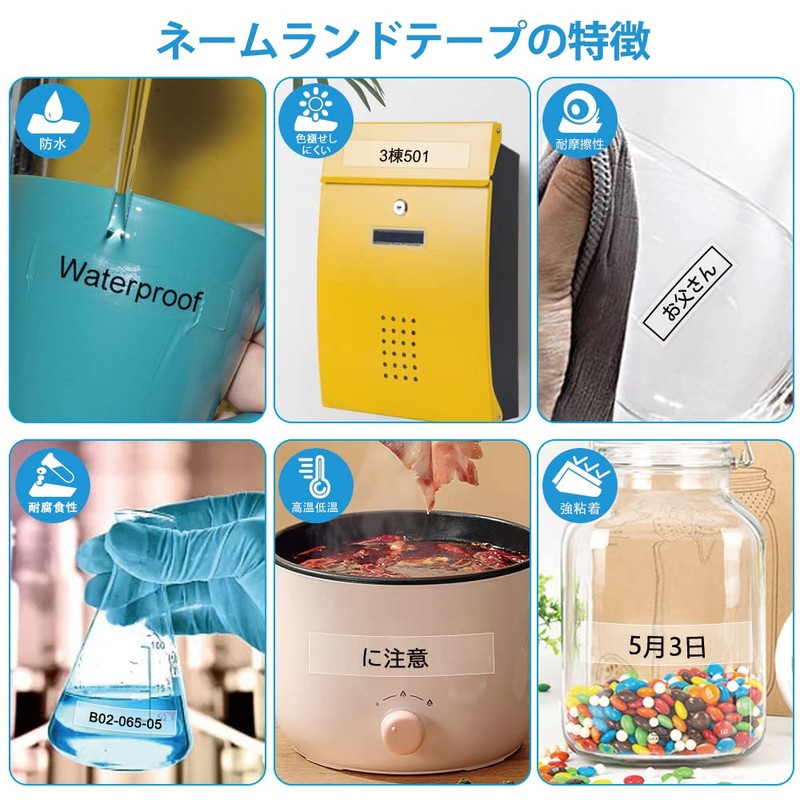 Water resistant and wet. It is also abrasion resistant and has a protective film on the surface of the label tape to prevent scratches and smudges of the text. High temperature resistance and can be applied in direct sunlight.