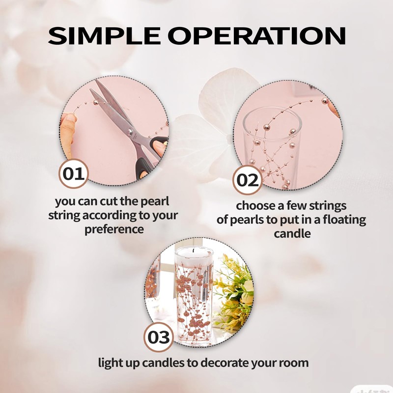 • 【Easy to Use】The floating candles are suitable for various types of vases or containers, the pearl string can be easily bent, and can be matched with any size and shape vase and floating candle water cup, just simply put the pearl string in normal water, no further arrangement or tool is required,make your vase look more beautiful and charming