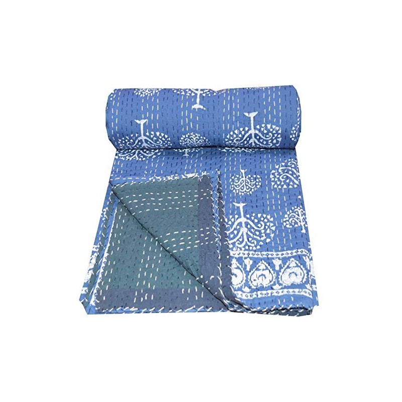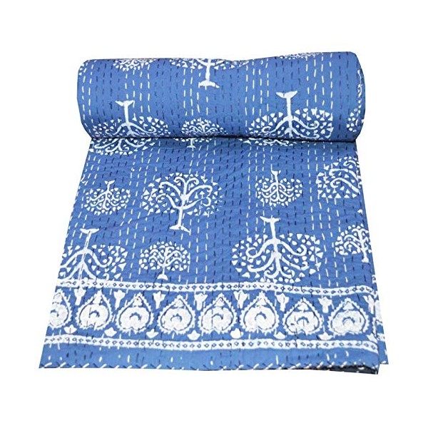 YUVANCRAFTS Indian Handmade Cotton Kantha Quilt Traditional Indigo Print Twin Quilt Blanket Bedspreads Throw (Blue)