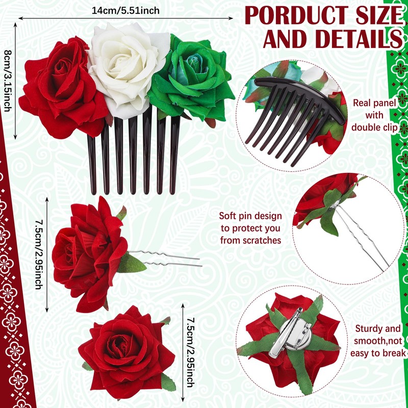 • Sufficient Quantity: if you buy our Mexican Independence Day rose clips, you will receive 7 red, white and green hair accessories, including 1 comb, 3 hairpin styles, and 3 hairpin pin styles; The styles are rich and the sufficient quantity can well meet your dressing needs during the Mexican Independence Day