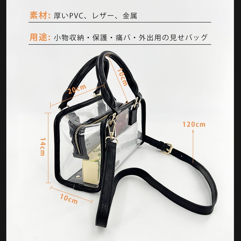 - Specifications: Product Name: Transparent 2-way shoulder bag. Material: Thick PVC, leather, metal. ◆Size: Length 7.9 inches (20 cm), Width 3.9 inches (10 cm), Height 5.5 inches Shoulder strap length: 120cm Handle height 10cm ◆Weight:0.45kg