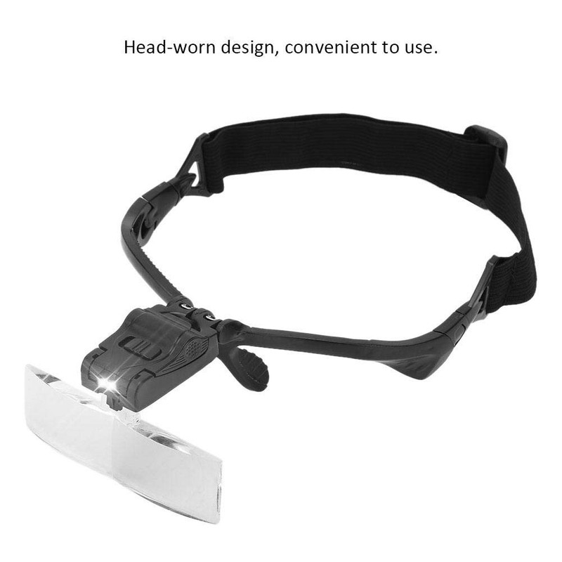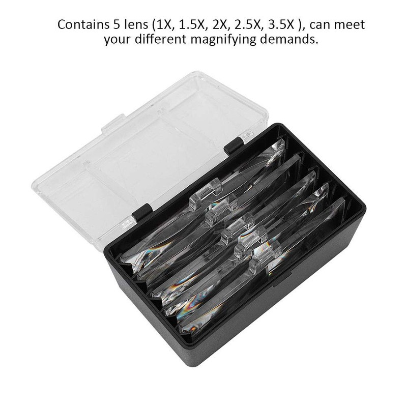 Contains 5 lenses (1X, 1.5X, 2X, 2.5X, 3.5X) that meet your different magnification requirements. With LED lights, you can see carefully and clearly even in dark environments. The main light can be adjusted to a good angle. Comes with an adjustable elastic headband: head worn design, convenient to use. The battery bearing can hold 3 x LR1130 button batteries. .Great product for eyelash eyelashes. extension or tattooing, specially designed for inspection of tiny parts.