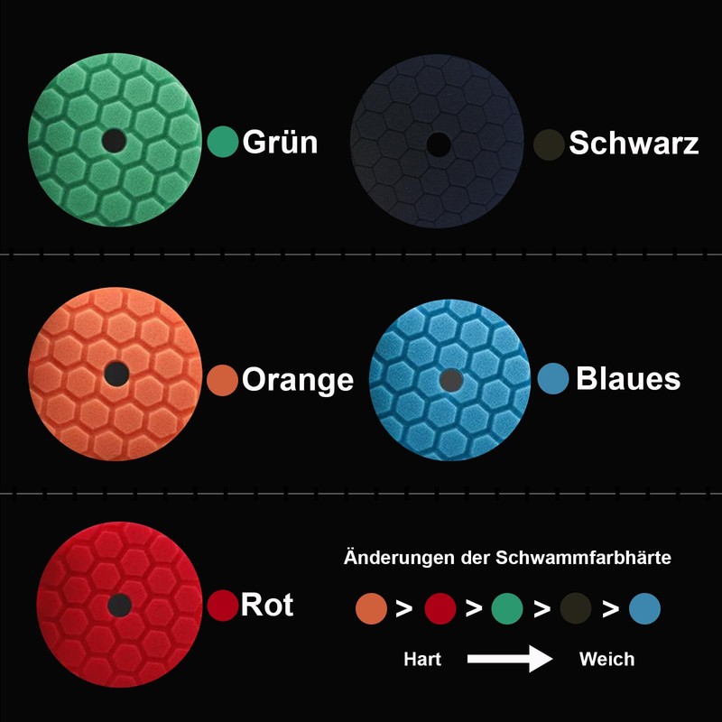 - Advanced manufacturing technology: soft and fine workmanship, does not damage the surface, washable and saves money. They are lightweight and really easy to assemble. There are five different colours of the sponge pad, hardness: orange > red > green > black > blue, efficient cutting and polishing of the most difficult areas.