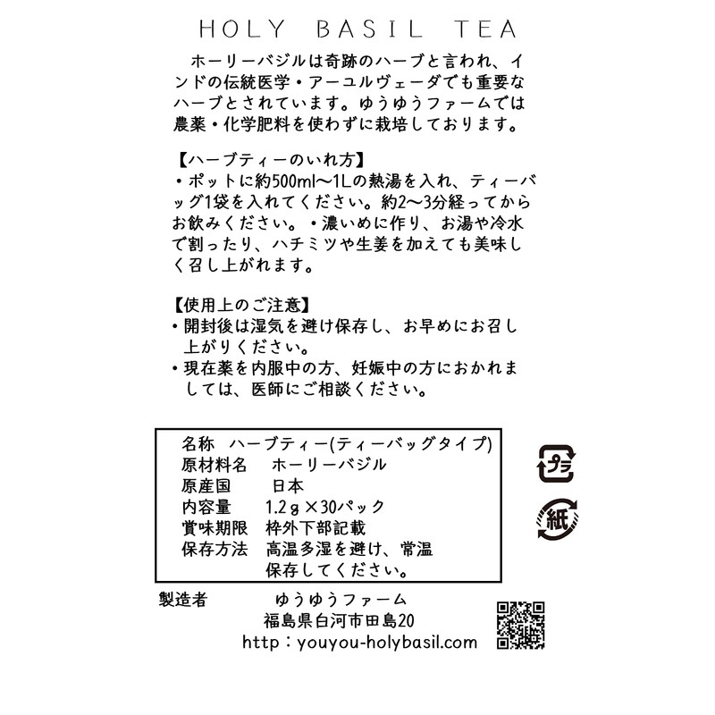Yuyu Farm Domestic Holy Basil Tea Bag Type (0.05 oz (1.2 g) x 30 Packs