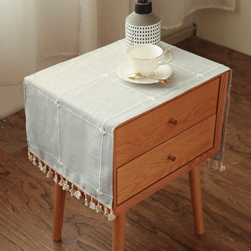 - Bedside table cloth is a great way to decorate your cozy bedroom and protect your cabinet / dresser / nightstand from dust and scratches. Great as nightstand runner, end table cover, dresser scarf, wooden tabletop decor, sideboard dust cover and more. It's also one of the best housewarming gifts for a friend
