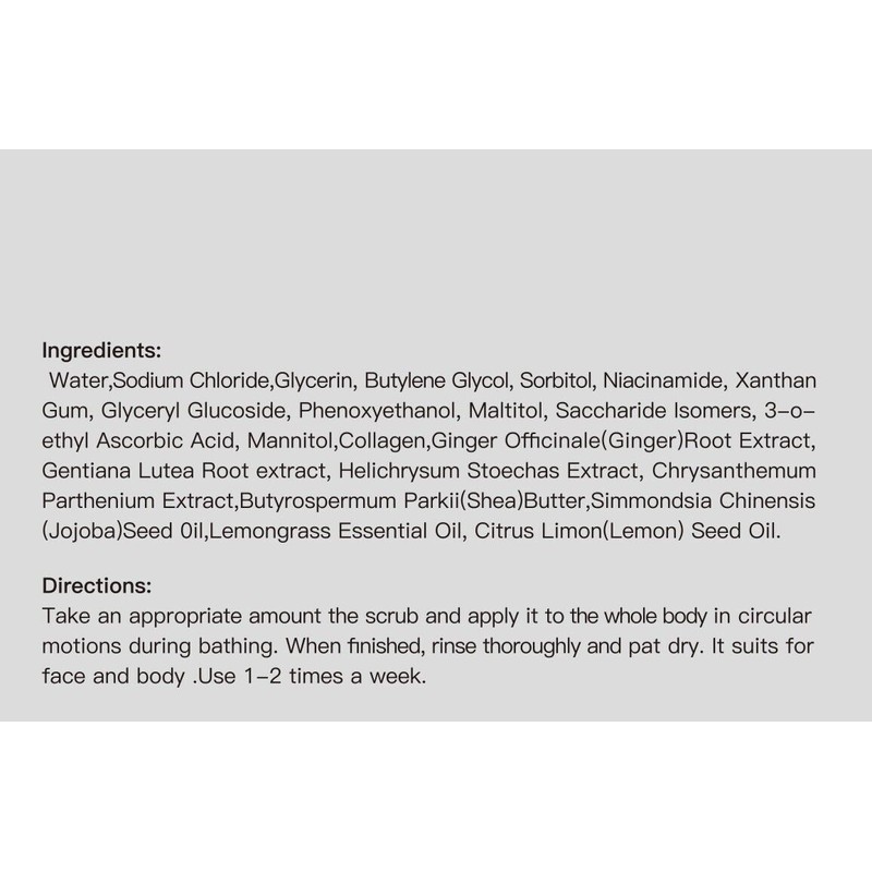 - Collagen promoting resilience and firmness, jojoba seed oil, lemongrass essential oil, ginger root extract, lemon seed oil and gentiana lutea root extract.