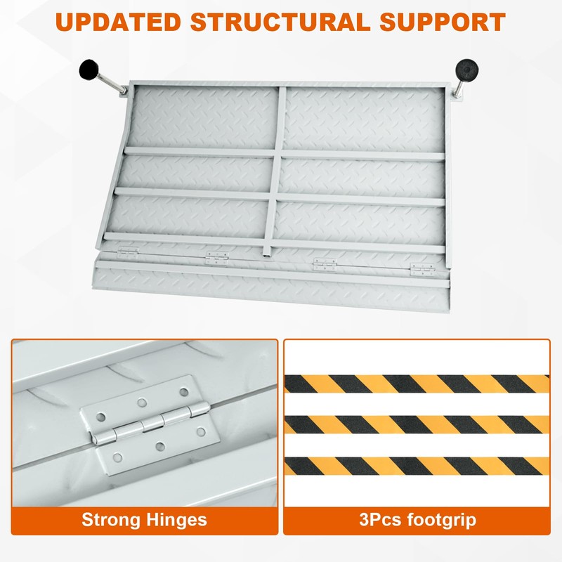 - Extended Entrance Design: The back of the ramp includes four sturdy hinges to adjust the front edge angle, effectively widening the entrance to better fit the ground without compromising load capacity. A platform design has been made at the top to help with smoother access