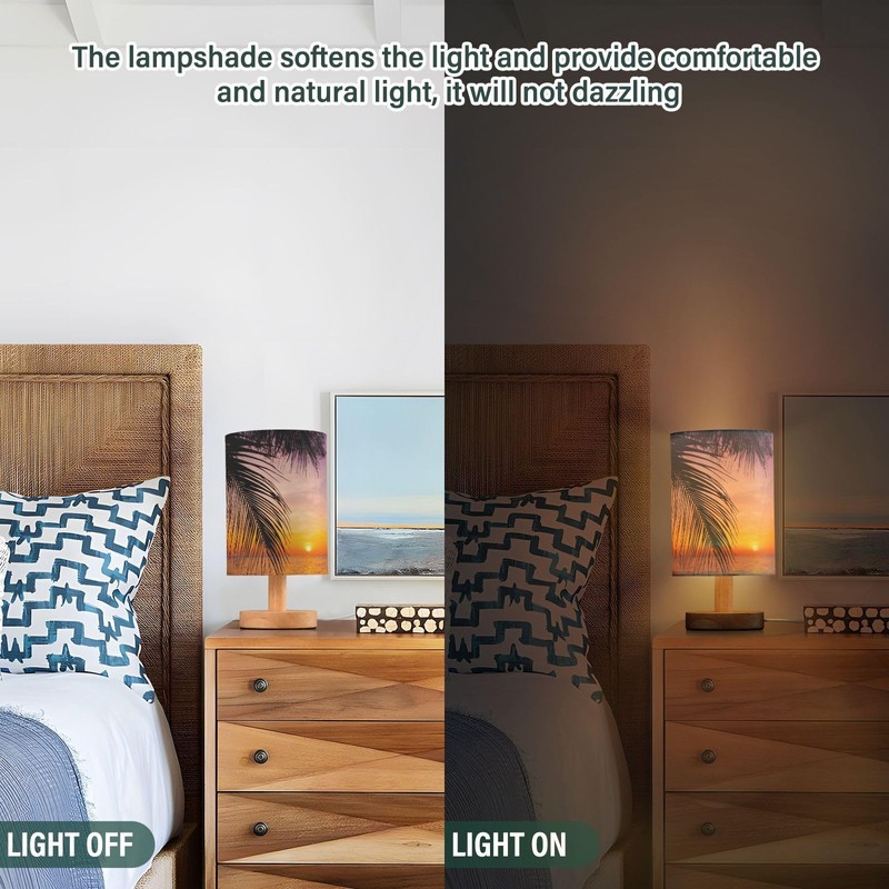 YYZZH Table Lamp Sunset Ocean Palm Tree Tropical Summer Nightstand Lamp with Wood Base Fabric Lamp Shade Bedside Desk Lamp for Living Room Bedroom Kids Room Office