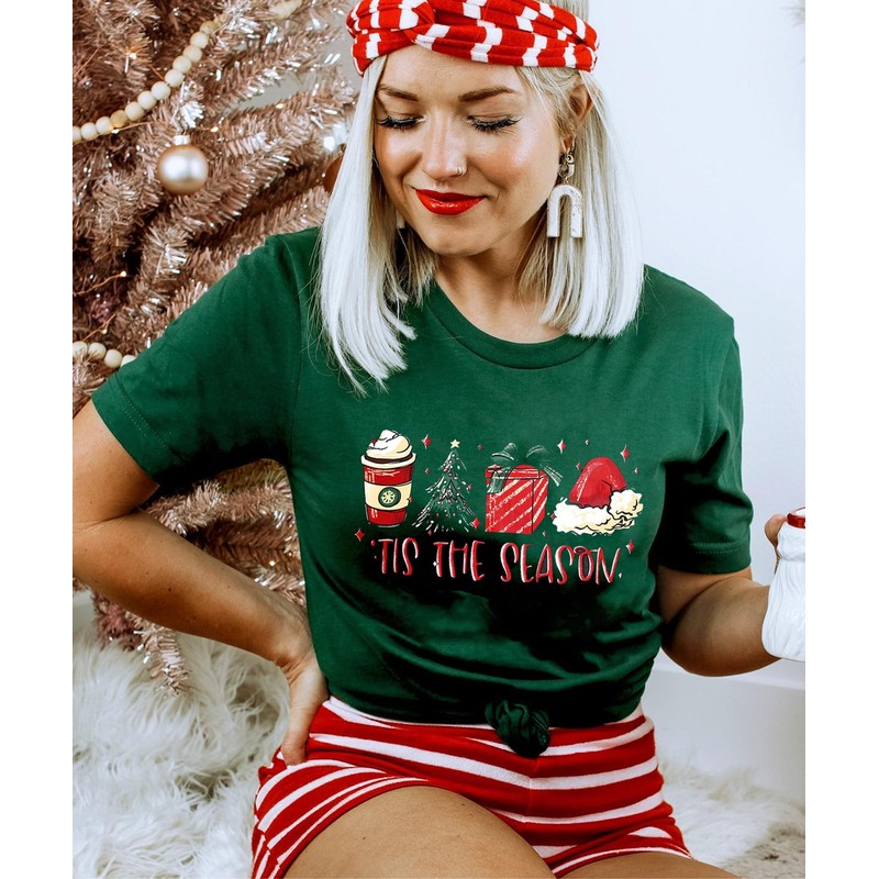 YZMI Tis The Season Christmas Tree T-Shirt Latte Coffee Xmas Gift Santa Hat Tee Tops Green XL