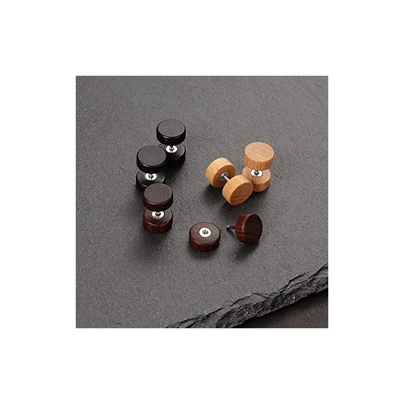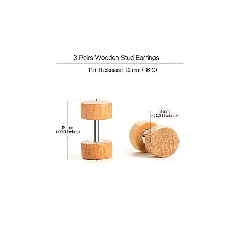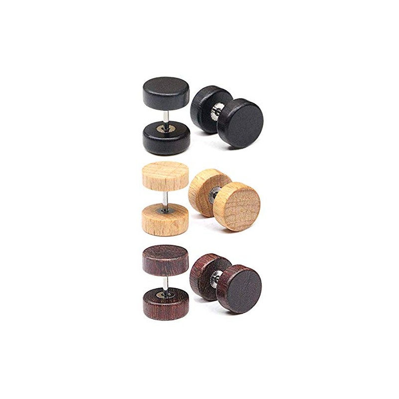 YZstyle 8mm Wood Faux Gauges Plugs Earrings for Men Women Wooden Fake Plugs Gauge Studs Circle Flat Back Cheater Tunnel Dumbbell Earrings Set (3 Pairs) (3pair a setE045)