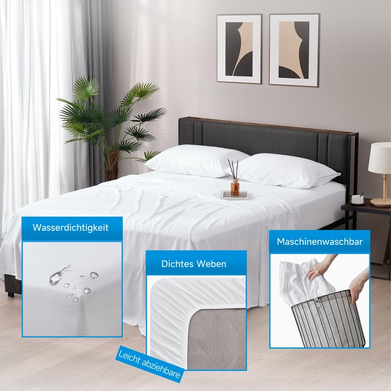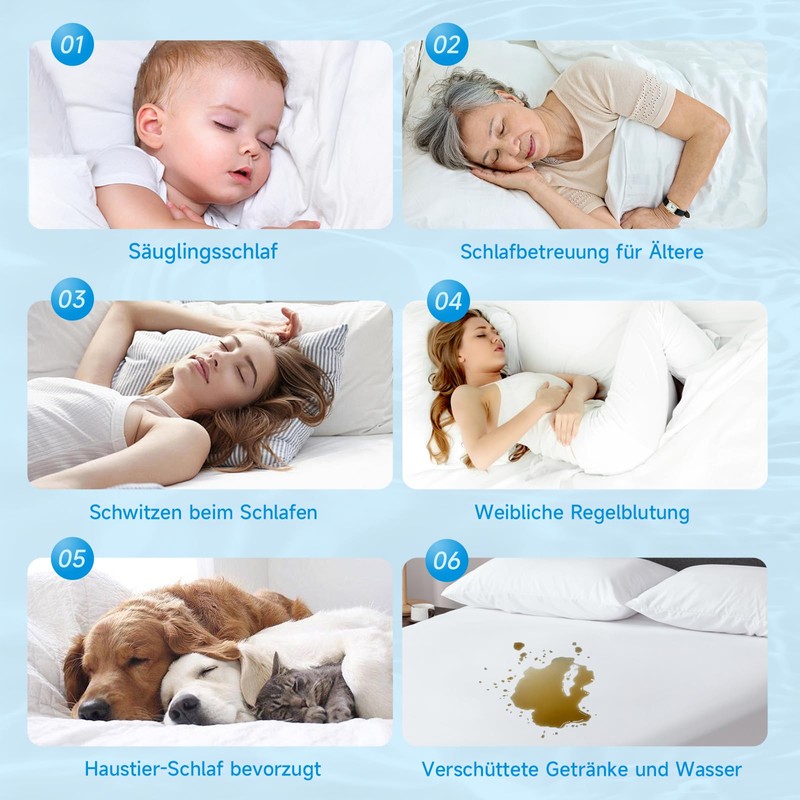- Restricted waterproof: the surface material of the fitted sheet has been treated with an impregnation that prevents short-term immersion in water and allows easy cleaning. Please note that the fitted sheet is not fully waterproof and may seep through with larger amounts of water poured over the fitted sheet or when pets urinate.