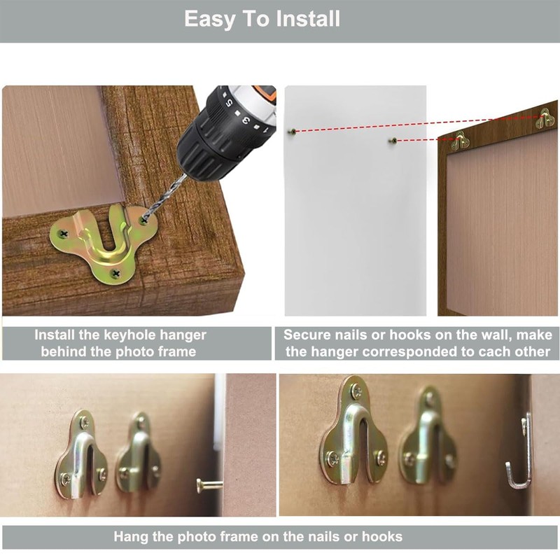 - Quick to Install The metal keyhole hanging clip comes with mounting screws. Just install the keyhole hanger behind the photo frame with screws, mark the distance to ensure the two keyhole hangers react to attach other, secure nails or hooks to the wall, then hang the picture frame on the nails or hooks