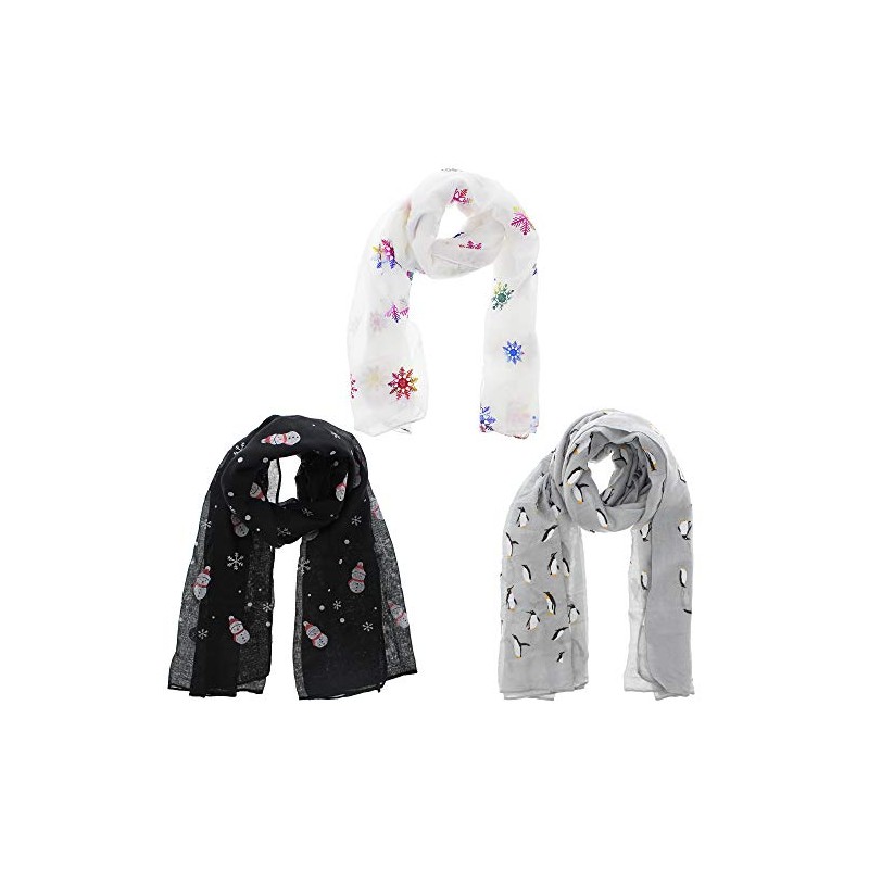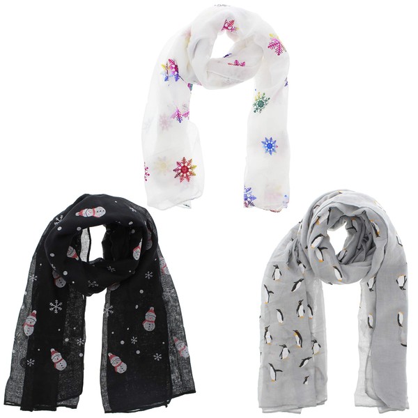 Zac's Alter Ego Set of 3 Ladies Lightweight Assorted Colour Rainbow Snowflakes/Mini Penguins/Snowmen & Snowflakes Christmas Festive Print Scarves