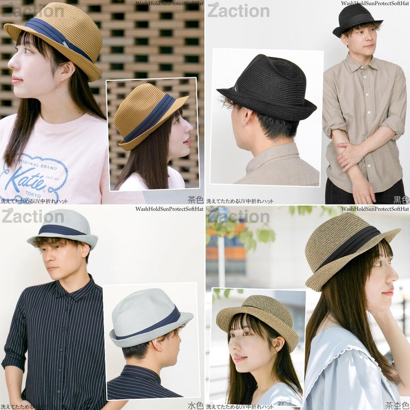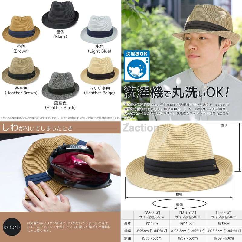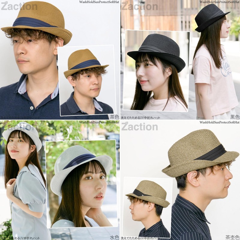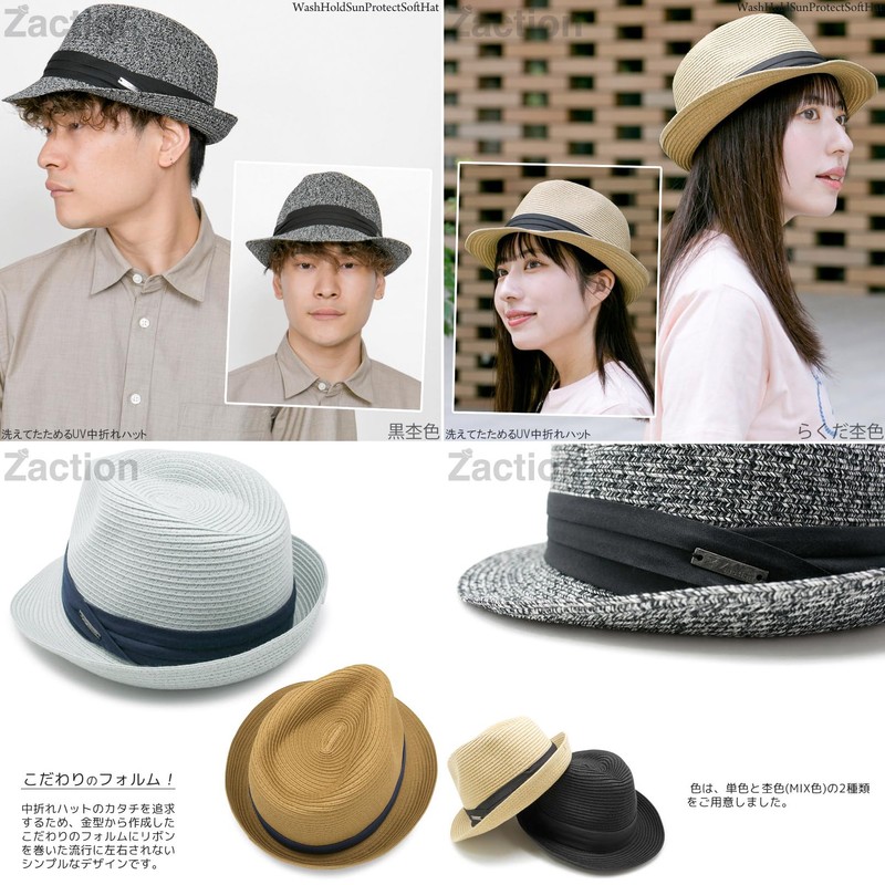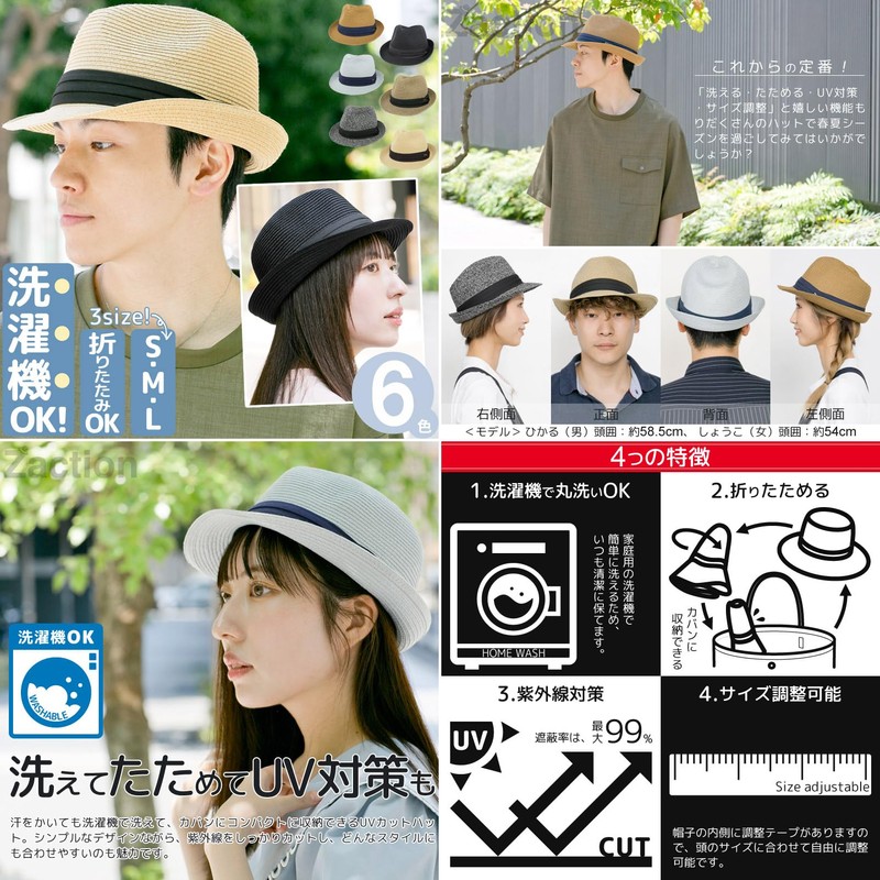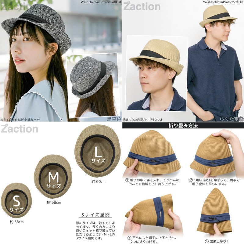 Zaction Men's Washable Hat, Large Size, Straw Hat, Women's, Washable, Foldable, UV Medium Folding Hat, Black