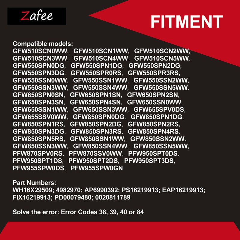 • Compatible with GE models: GFW510SCN0WW GFW510SCN1WW GFW510SCN2WW GFW510SCN3WW GFW510SCN4WW GFW510SCN5WW GFW550SPN0DG GFW550SPN1DG GFW550SPN2DG GFW550SPN3DG GFW550SPR0RS GFW550SPR3RS GFW550SSN0WW GFW550SSN1WW GFW550SSN2WW GFW550SSN3WW GFW550SSN4WW GFW550SSN5WW GFW650SPN0SN GFW650SPN1SN GFW650SPN2SN GFW650SPN3SN GFW650SPN4SN