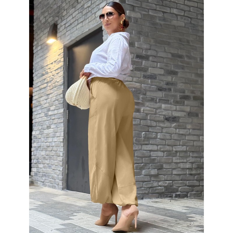 ZAFUL Womens Baggy Pants Cotton Linen Casual Summer Palazzo Pants Drawstring Waist Lounge Cinch Bottom with Pockets Khaki M