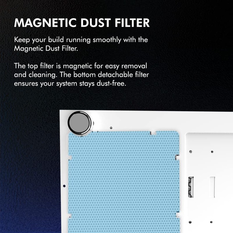 • Magnetic Dust Filter: Keep your build running smoothly with the Magnetic Dust Filter. The top filter is magnetic for easy removal and cleaning, and the bottom detachable filter ensures your system stays dust-free. The metal feet with rubberized cushions absorb vibrations for silent operations.