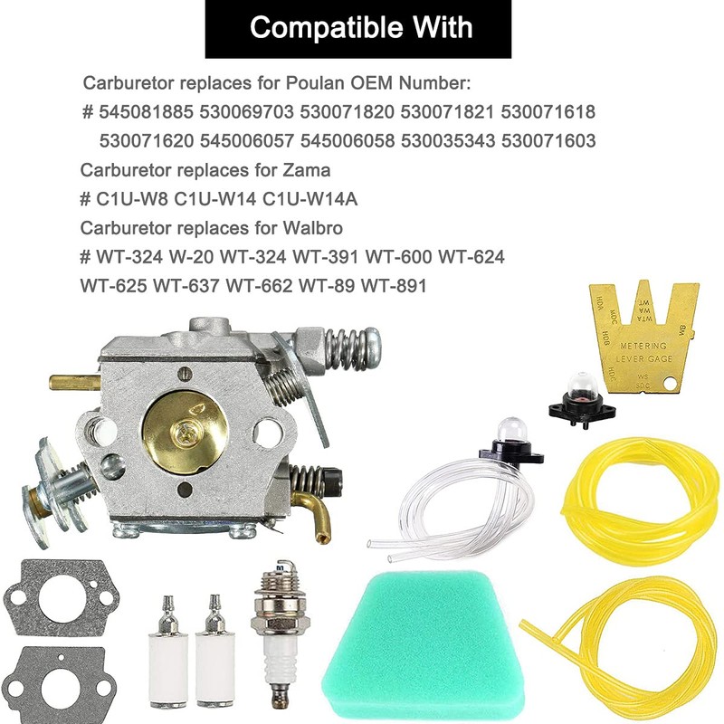 ZAMDOE C1U-W8 C1U-W14 Carburetor Kit for Poulan 2150 1950 2050 2375 2550 Wild Thing Chainsaw Replace WT-600 WT-624 WT-625 WT-89 WT-89 WT-324 with Air Filter Fuel Line