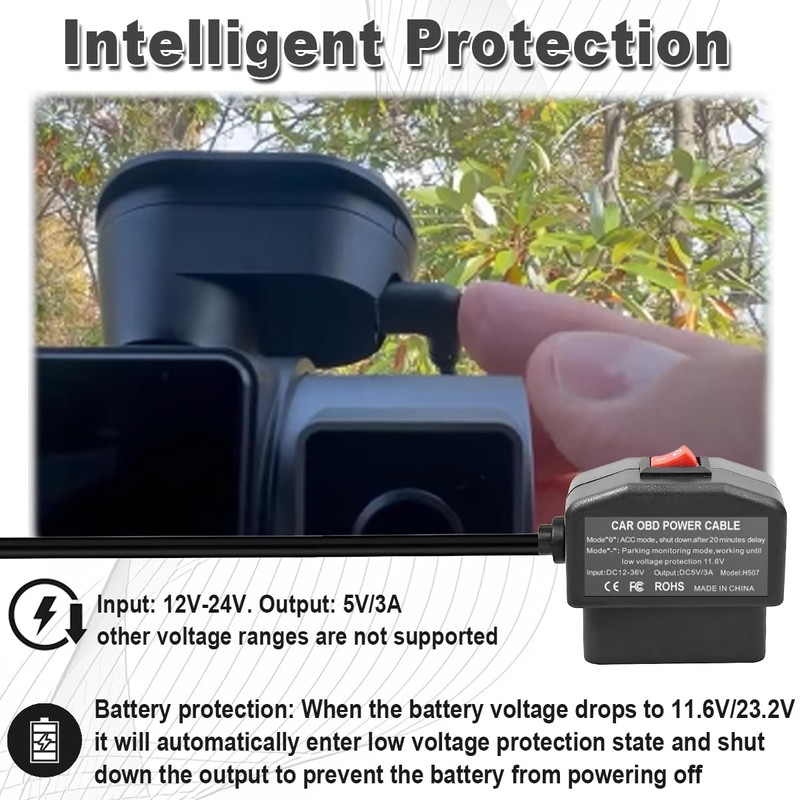 - Intelligenter Schutz: Das OBD2-Dashcam-Stromkabel Typ C verfügt über einen integrierten Chip, der die Batteriespannung in Echtzeit überwacht. Wenn die Batteriespannung auf 11,6 V oder 23,2 V abfällt, aktiviert das OBD-Kabel automatisch den Unterspannungsschutz und schaltet den Ausgang ab, um ein Abschalten der Batterie zu verhindern
