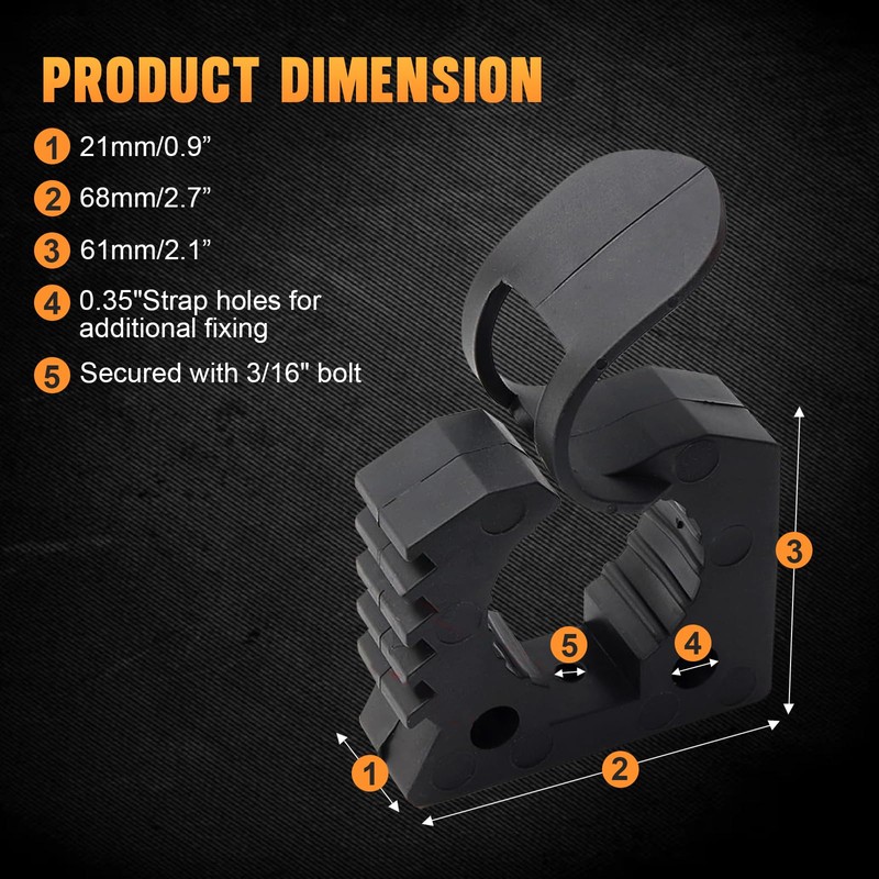 - Diversidad funcional: nuestro clip de montaje de goma de liberación rápida es ajustable con un rango de diámetro de 1-1/7 pulgadas a 1-3/7 pulgadas, lo que te permite ajustar según sea necesario, extender el espacio de almacenamiento y proteger tu pala de saltar o perder mientras conduces.