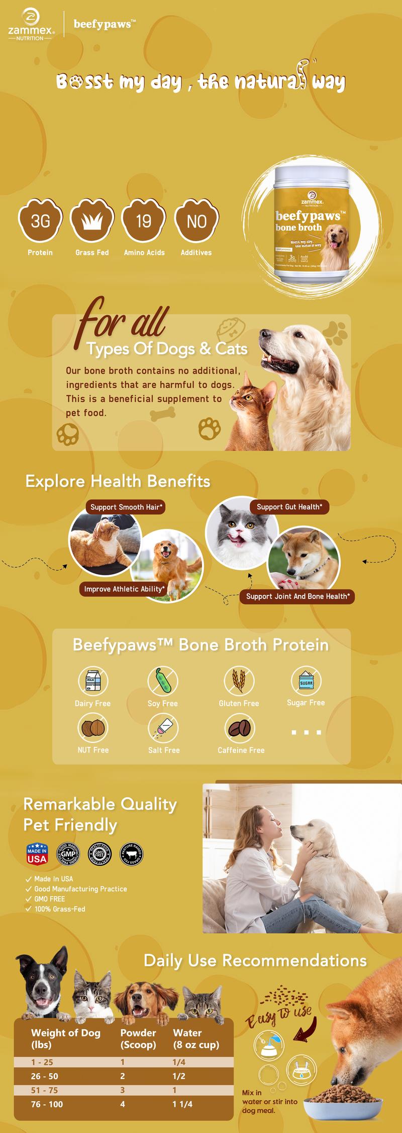 Outstanding Quality: Zammex Beefypaws Bone Broth contains Grass-fed Bovine Bone Broth and natural hydrolyzed collagen.The bone broth powder could serve your pets with pure protein and 19 amino acids to improve overall wellness.