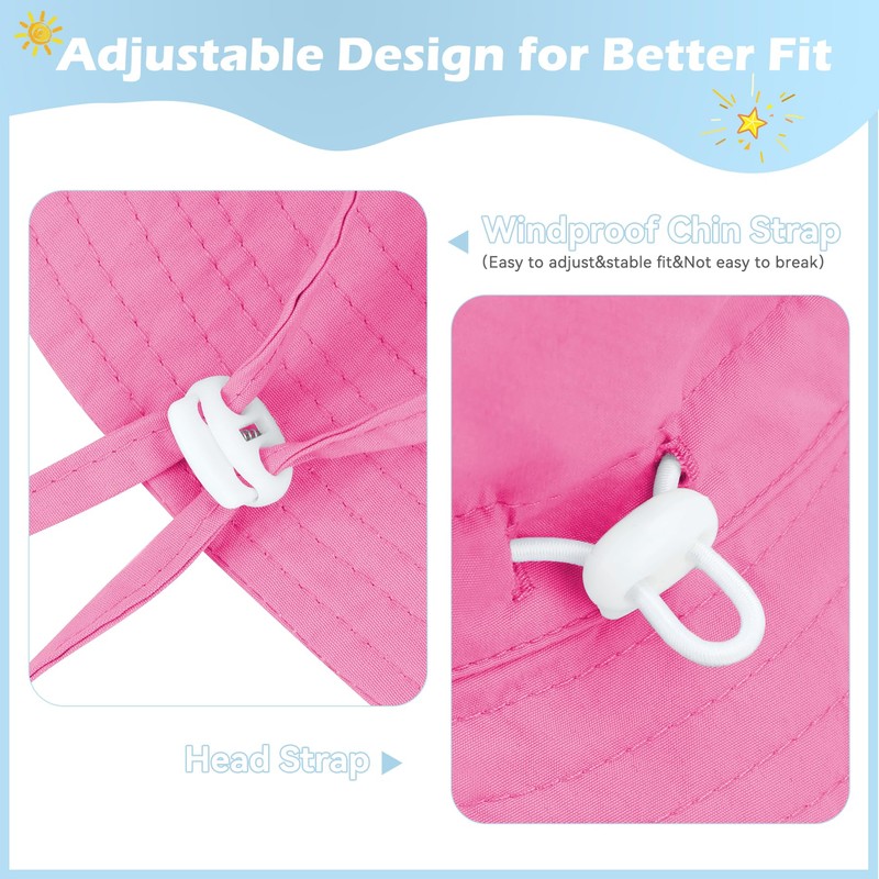 - Adjustable & Foldable: Chin strap and adjustable toggle at back for custom fit & to grow with baby. Easy to put on and stay on, our caps and hats include a gentle chin strap so it stays secure for all-day play. Adjustable and foldable, easy storage, travel friendly.