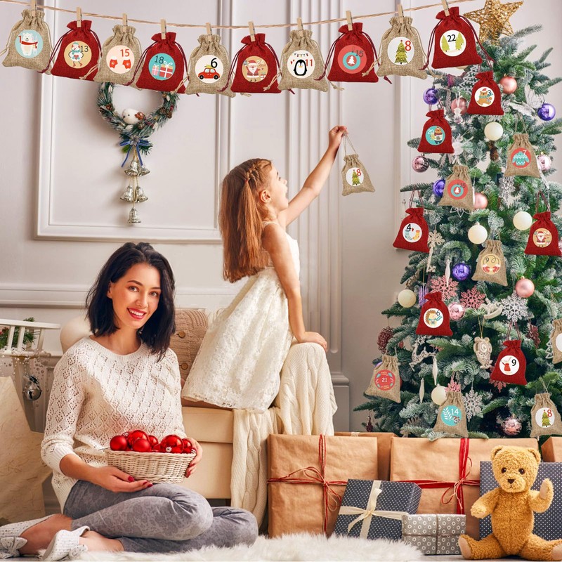 - COMPLETE ADVENTURE CALENDAR SET This self-fillable advent calendar contains 12 yellow jute bags, 12 red jute bags, 24 numbered stickers (2 sheets), 24 wooden pegs and 5 meters jute rope, ensuring a perfect Christmas countdown experience. Each bag can be attached numbered stickers to mark the date, so children and adults can enjoy small surprises every day