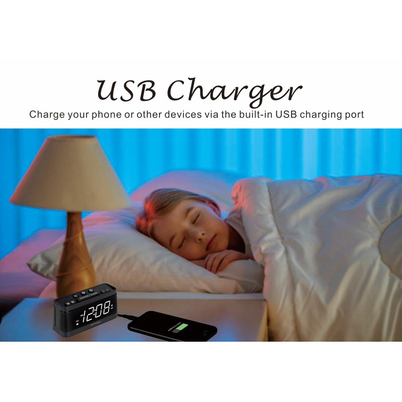 ๐—˜๐—”๐—ฆ๐—ฌ ๐—ง๐—ข ๐—จ๐—ฆ๐—˜ DUAL ALARM CLOCK: This ๐—ฑ๐—ถ๐—ด๐—ถ๐˜๐—ฎ๐—น ๐—ฑ๐˜‚๐—ฎ๐—น ๐—ฎ๐—น๐—ฎ๐—ฟ๐—บ๐˜€ ๐—ฐ๐—น๐—ผ๐—ฐ๐—ธ ๐—ณ๐—ผ๐—ฟ ๐—ฏ๐—ฒ๐—ฑ๐—ฟ๐—ผ๐—ผ๐—บ can set 2 different alarms, convenient for family members with a different schedule. A ๐—ฏ๐—ฎ๐˜€๐—ถ๐—ฐ ๐—ฐ๐—น๐—ผ๐—ฐ๐—ธ with enough practical functions for daily use: wake by radio or beep alarm, adjustable digits brightness dimmer, adjustable volume control, selectable alarm volume level, days of week display, built-in USB charging port, SNOOZE function for extra 9 minutes sleep, outlet operated with battery backup settings. LARGE DISPLAY WITH DIMMER CONTROL: ๐—ฉ๐—ฒ๐—ฟ๐˜† ๐—น๐—ผ๐˜‚๐—ฑ ๐—ฎ๐—น๐—ฎ๐—ฟ๐—บ ๐—ฐ๐—น๐—ผ๐—ฐ๐—ธ ๐—ณ๐—ผ๐—ฟ ๐—ต๐—ฒ๐—ฎ๐˜ƒ๐˜† ๐˜€๐—น๐—ฒ๐—ฒ๐—ฝ๐—ฒ๐—ฟ๐˜€ with LED ๐—น๐—ฎ๐—ฟ๐—ด๐—ฒ ๐—ฐ๐—น๐—ฒ๐—ฎ๐—ฟ ๐—ฑ๐—ถ๐˜€๐—ฝ๐—น๐—ฎ๐˜† for vision impaired people, easy to check time from across the room. Alarm can be wake by radio or beep alarm. Adjustable digits brightness dimmer for easy reading, brighter for day while darker for night. NO WORRY BATTERY BACKUP SETTINGS WITH SNOOZE: This ๐—ฝ๐—น๐˜‚๐—ด ๐—ถ๐—ป ๐—ฎ๐—น๐—ฎ๐—ฟ๐—บ ๐—ฐ๐—น๐—ผ๐—ฐ๐—ธ๐˜€ ๐—ณ๐—ผ๐—ฟ ๐—ฏ๐—ฒ๐—ฑ๐—ฟ๐—ผ๐—ผ๐—บ is outlet operated for ALL functions working, such as USB charging, alarm and time display. ๐——๐˜‚๐—ฎ๐—น ๐—ฎ๐—น๐—ฎ๐—ฟ๐—บ ๐—ฐ๐—น๐—ผ๐—ฐ๐—ธ ๐˜„๐—ถ๐˜๐—ต ๐—ฏ๐—ฎ๐˜๐˜๐—ฒ๐—ฟ๐˜† ๐—ฏ๐—ฎ๐—ฐ๐—ธ๐˜‚๐—ฝ time and alarm settings as well as trigger the alarm when power failure. Simply press the โ€œSNOOZEโ€ button on the top to get extra 9 minutes sleep before it alerts again. FM RADIO WITH PRESET STATIONS: Relax on anywhere with your preferred channels, music, or news using the digital FM radio with adjustable volume. Shuts off the radio sound in between 5 to 120 minutes depending on your setting, so you can fall asleep to your favorite station playing. USB PHONE CHARGER: ๐—Ÿ๐—ฒ๐—ฑ ๐—ฏ๐—ฒ๐—ฑ๐˜€๐—ถ๐—ฑ๐—ฒ ๐—ฎ๐—น๐—ฎ๐—ฟ๐—บ ๐—ฐ๐—น๐—ผ๐—ฐ๐—ธ ๐˜„๐—ถ๐˜๐—ต ๐—ฝ๐—ต๐—ผ๐—ป๐—ฒ ๐—ฐ๐—ต๐—ฎ๐—ฟ๐—ด๐—ฒ๐—ฟ allows you to charge your smartphone, iPad or other smart devices, no need to plug them in the wall. Clear understandable buttons make it ๐—ฒ๐—ฎ๐˜€๐˜† ๐˜๐—ผ ๐˜€๐—ฒ๐˜, perfect for ๐—ธ๐—ถ๐—ฑ๐˜€ ๐˜€๐—ฒ๐—ป๐—ถ๐—ผ๐—ฟ๐˜€. Stylish appearance is suitable for ๐˜๐—ฒ๐—ฒ๐—ป๐˜€ ๐—ฏ๐—ผ๐˜†๐˜€ ๐—ด๐—ถ๐—ฟ๐—น๐˜€ too! Note: Products with USB cable. Please check compatibility before purchasing.