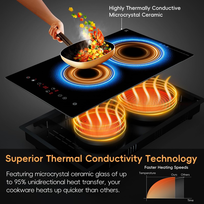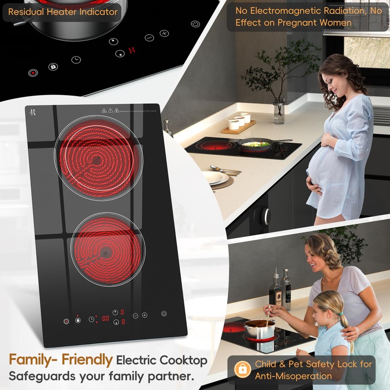 - [Family-Friendly Cooking - Cooktop Safety Features]: Zarbaco Electric Cooktop is designed with your family's safety in mind. Equipped with residual heat indicator to prevent burns, a child and pet safety lock for accidental touch, this electric ceramic cooktop is a safe choice. Unlike induction cooktops, it's no electromagnetic radiation, making it safe for pregnant women to use.