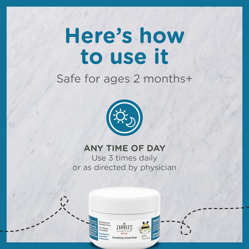 Zarbees Baby Soothing Chest Rub is a petroleum-free chest rub for babies that features a blend of eucalyptus & lavender oils in a beeswax & shea butter balm to help soothe your little one without harsh chemicals or toxins. Made for infants 2 months+; this non-irritating balm is specially formulated for baby’s sensitive skin. Massage it onto the chest; neck; back; & bottom of the feet. This gentle; safe & effective chest rub is made with no artificial fragrances or dyes and smells great. Pediatrician recommended chest rub soothes gently on babies and is a great option for sensitive skin. This product is produced by Zarbee’s; the makers of the #1 Pediatrician Recommended Cough Syrupⱡ Brand for Babies & Kids 12 & under. ⱡSoothes coughs associated with hoarseness; dry throat and irritants.* *These statements have not been evaluated by the Food and Drug Administration. This product is not intended to diagnose; treat; cure; or prevent any disease.