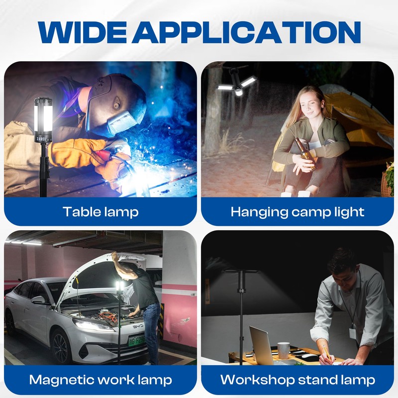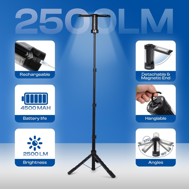 Zarei Rechargeable LED Camping Light with 2.5-6ft Detachable Tripod Stand; Cordless Mechanic Work Light - Magnetic and Hook; 3 Rotating LED Lamp Heads - 2500 Lumens; Waterproof Outdoor Camping Gear
