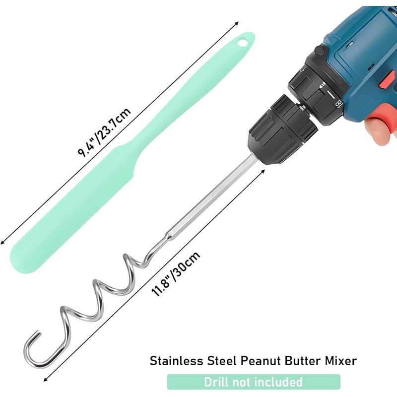 - All-in-One Mixing & Spreading Set This premium bundle includes an 11.8-inch stainless steel peanut butter mixer and a bonus silicone spreader knife—your ultimate duo for effortlessly blending and serving creamy spreads. The compact mixer (30 x 3 x 3 cm / 11.8 x 1.18 x 1.18 in) stores neatly in drawers, while the flexible spreader adds sleek utility to your kitchen essentials.