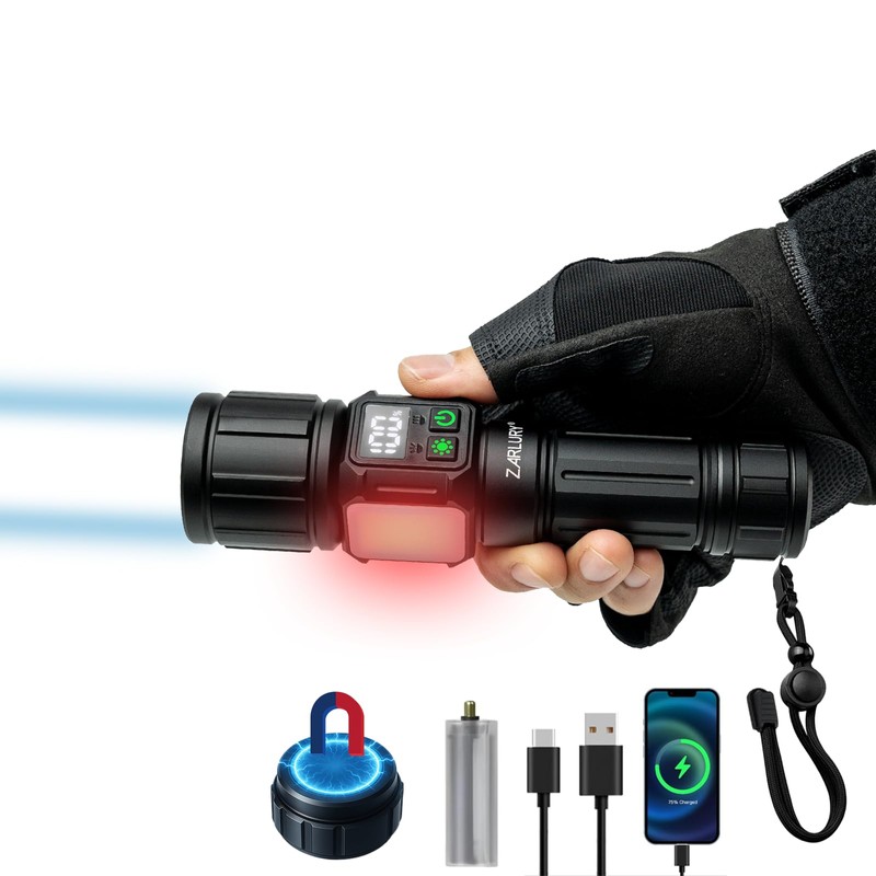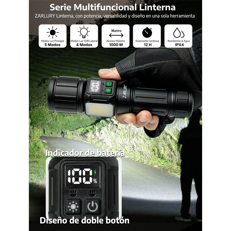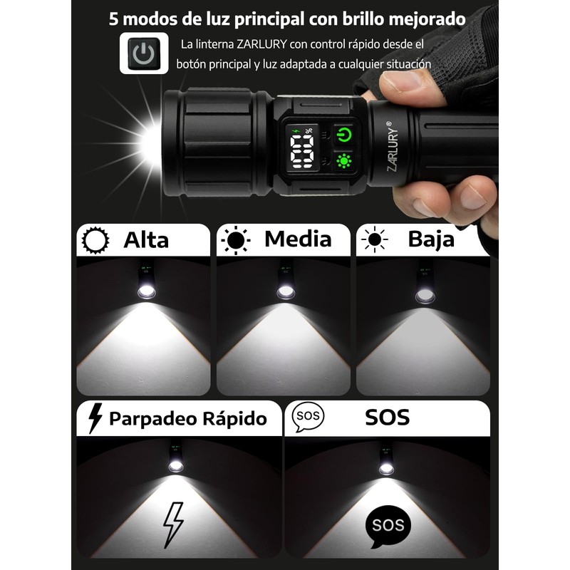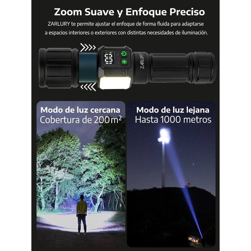 - 【Alta Potencia en Lúmenes para una Iluminación de Largo Alcance】 Con una impresionante linterna potente de 6000 lúmenes y un alcance de hasta 1000 metros en modo de largo alcance, además de una cobertura de hasta 200 metros cuadrados en modo de luz de cerca, esta linterna ofrece una iluminación clara y eficiente. Diseñada por ZARLURY para garantizar máximo rendimiento y visibilidad en cualquier entorno oscuro