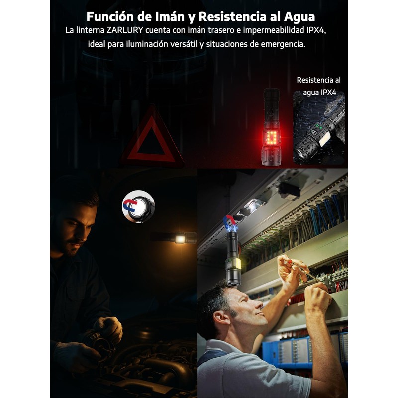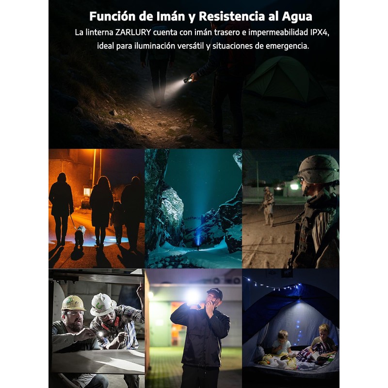 - 【ZARLURY Serie de Iluminación Múltiple Linterna Recargable 】Esta linterna recargable ZARLURY ha sido bien recibida en el mercado por su diseño innovador y calidad superior, superando a otras lámparas recargables. No solo ofrecemos una calidad que otros no pueden igualar, sino que también mejoramos la funcionalidad y el brillo en comparación con otros modelos. Integra una potente luz principal, varios modos COB, indicador de porcentaje de batería y base magnética en la parte trasera. Perfecta para camping, reparaciones y actividades nocturnas, convirtiéndose en una lámpara de mano potente sin igual.