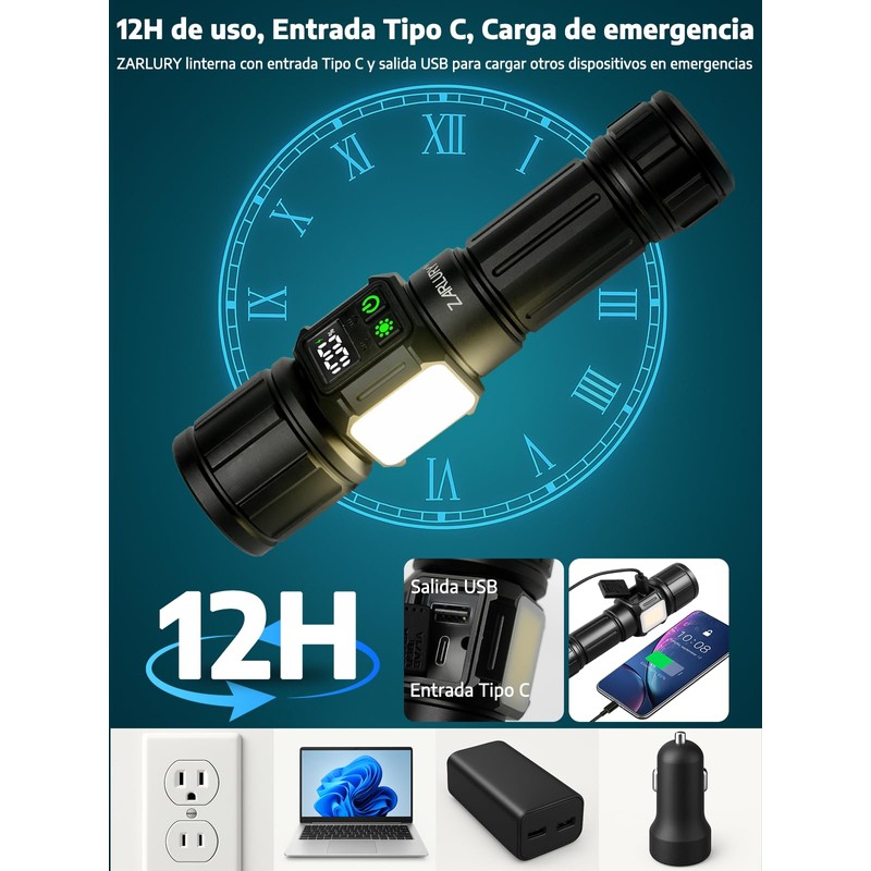 - 【Linterna recargable de larga duración】 Esta linterna recargable ofrece un rendimiento prolongado. Puedes disfrutar de hasta 8 horas de uso en modo de baja intensidad, 12 horas en modo COB de baja intensidad y 4 horas en alta intensidad. Su diseño eficiente asegura que siempre tendrás luz cuando más la necesites.