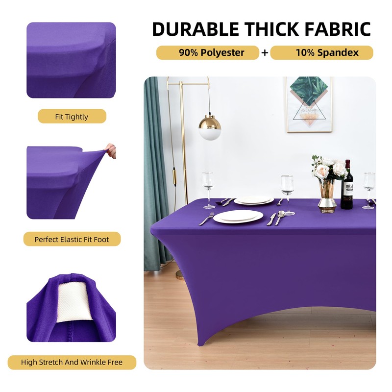Introducing the ultimate solution for your table dressing needs - our high-quality, stretchy spandex table cover! Designed to fit standard, folding, banquet, and rectangular tables perfectly, this table topper is a must-have for any event, from birthday parties and weddings to trade shows and festivals. Crafted from a durable blend of polyester and spandex, it boasts exceptional elasticity, ensuring a tight, fitted look that resists wrinkles and stains. Whether you're setting up for a BBQ, cocktail party, or anniversary celebration, our reusable and washable table protector is your go-to for a sleek, professional appearance. Its universal fit makes it ideal for dinning tables, patios, and kitchen setups, offering protection and style in one. Elevate your next event with our stain-resistant, stretchy table cover, and watch as it transforms your space into a high-quality, vendor-approved showcase. Don't settle for less; choose our table topper for a durable, elastic, and stylish solution that stands up to any occasion!
