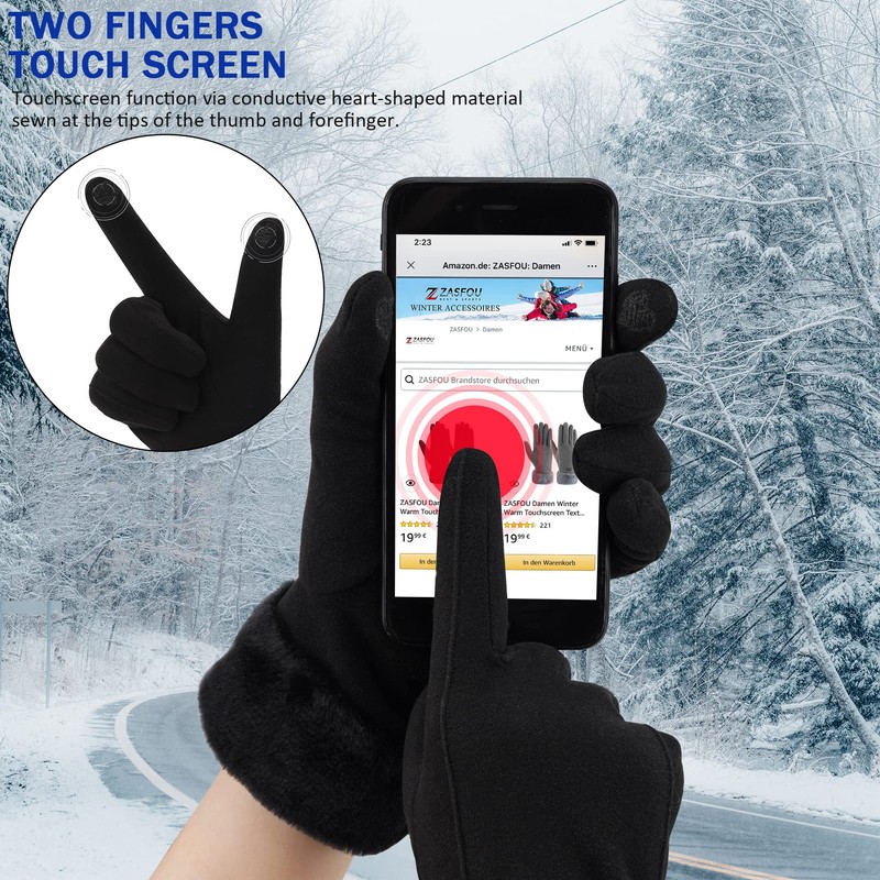 - TOUCH SCREEN GLOVES The touch screen design of thumb and index finger, you can wear the gloves on the touch screen of your smartphone, tablet or other touchscreen devices without having to take off the gloves in cold weather.
