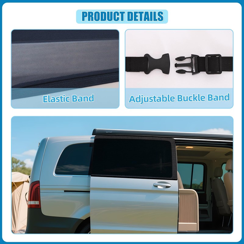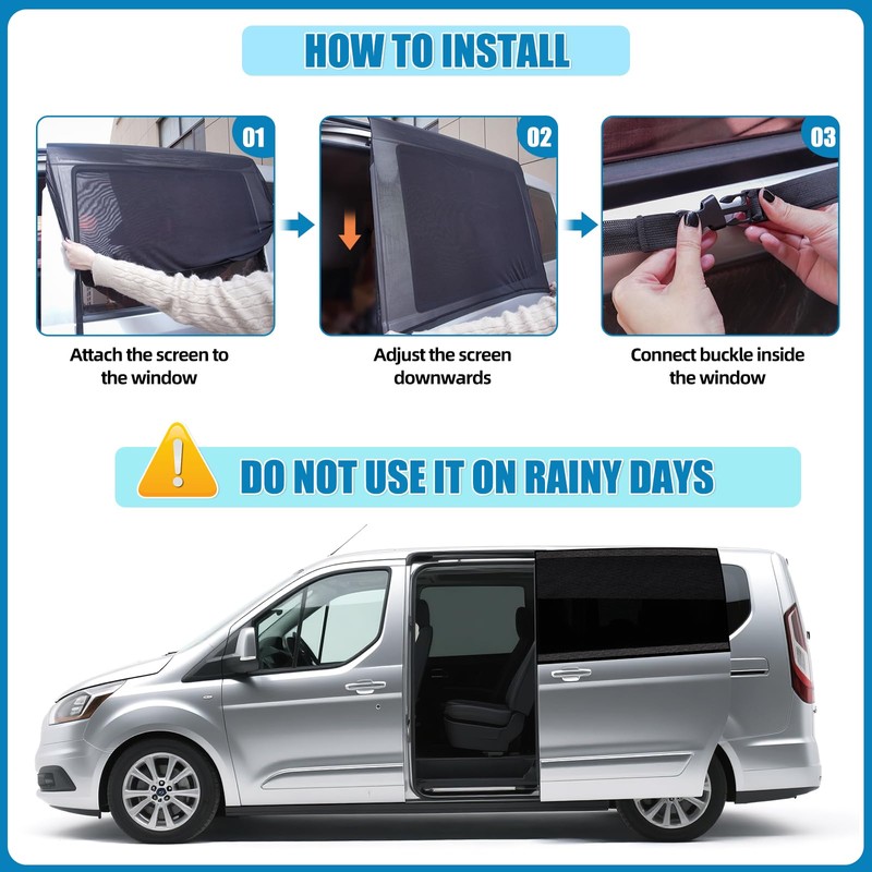 - Innovative Design & Easy Installation: First, attach the car camping window covers to the window. Then, gently adjust it downwards to fit properly. Finally, connect the buckle inside the window to secure the screen in place. Installation is quick and easy—no tools required.(For detailed installation steps, please watch the video on the detail page).What's more,mesh window covers for car camping with double-buckle design, the two sides are distributed at both ends of the extension belt, avoiding the installation trouble caused by the car window is too long