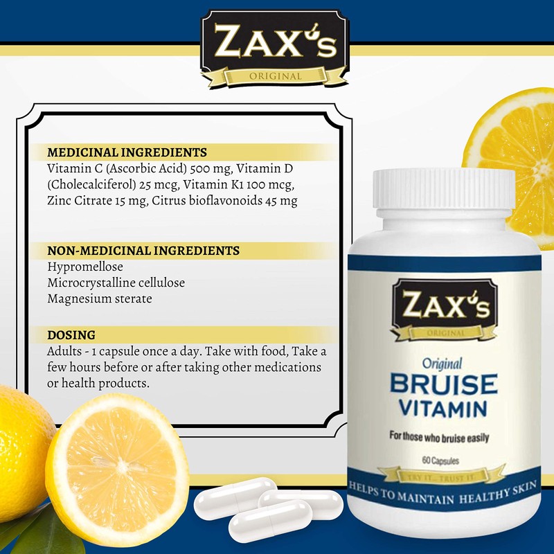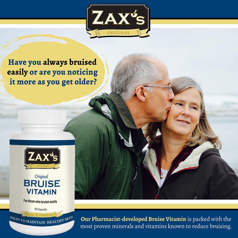 Zax's Original Bruise Vitamins for Faster Bruise Recovery and Healthy SkinOur anti-bruising capsules help in healing bruises more efficiently. If you get bruised easily or are noticing it takes longer to heal as you get older, you have come to the right place! Our pharmacist-developed Bruise Vitamin is packed with minerals and vitamins to support the fastest recovery from bruising. Our wound healing capsules also help in maintaining healthy skin as they are enriched with vitamins K1, D3, C and A. All Zax's products are backed by our 100% satisfaction guarantee.Natural Blend of Vitamins & Minerals:Vitamin C, D3, K1, Zinc, and Citrus Bioflavonoids Formulated in a GMP Certified and FDA Licensed Facility 100% Gluten-FreeZax's Original Anti-Bruising Supplement BenefitsSupports Connective Tissue Formation Promotes Wound Healing Maintains Healthy Skin NOTE: If you are taking blood thinners, consult with your healthcare practitioner prior to use.