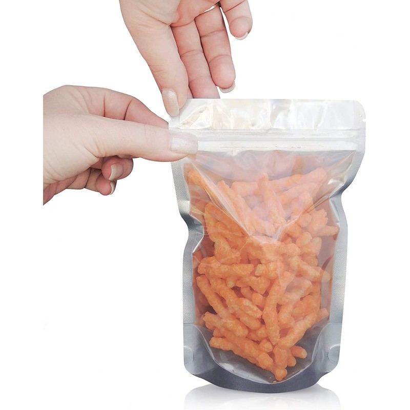 - HIGH QUALITY HEAVY DUTY ZIPLOCK: Perfect heat sealable bags for food with a thick barrier, clear front view and aluminum foil back that enhance the durability of the stand up pouches. The resealable zippers are strong enough to keep your food safe inside without popping open.