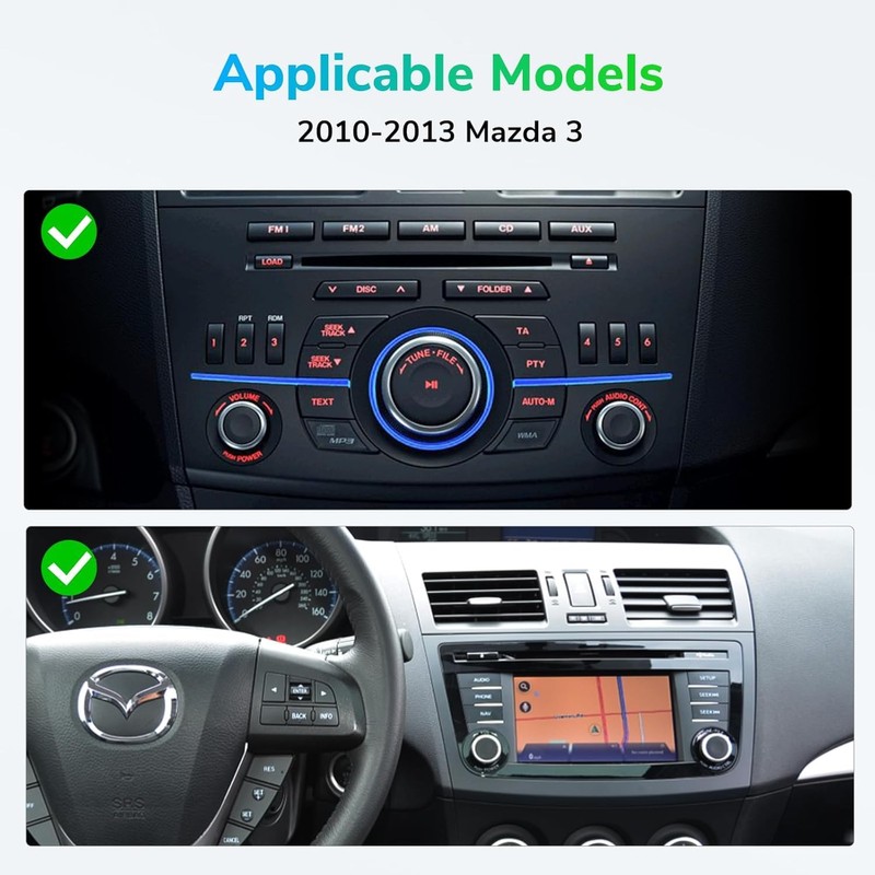- 【𝐏𝐥𝐮𝐠 & 𝐏𝐥𝐚𝐲】Car radio is compatible with Mazda 3 2010-2013. No additional frame, no cable change, no need to set up. It comes with CANBUS and -supports most of the original functions, including steering wheel control, reverse signal and etc. If you are not sure if it will fit your car or how to install it, please let us know.
