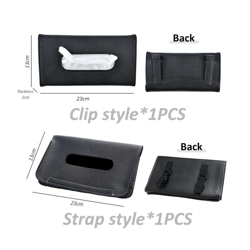 - [Product content] You will receive 2 pieces car tissue boxes made of black leather, each with a size of 23 x 13 cm, including 1 clip type and 1 strap type, suitable for installation on the sun visor and seat back of the car, easy access to paper towels.